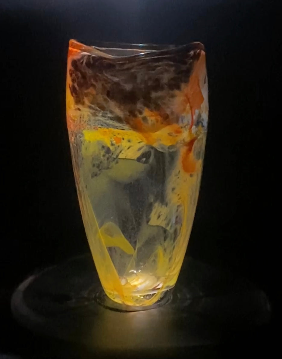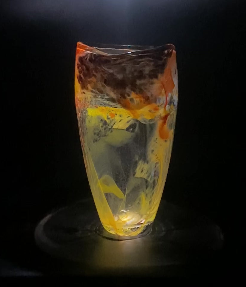 Inspired by the Quantocks Hills in Somerset, this range has grown in to a firm favourite. The pieces are all completely unique. This is an unsandblasted version in oranges and golds. There was just one spot where the sunlight hit the side of a bank, and these colours just jumped out. There are so many layers when you start looking closely, all seemingly fighting for attention