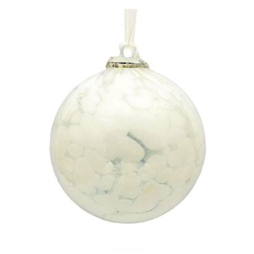 Our Baubles are made by gathering hot glass onto the end of a blowing iron, covering that "gather" in coloured chips and powder. The glass is then reheated, shaped and blown to create a hollow sphere. This is then "knocked" off the iron and a small gather of clear glass is then added to the top of the piece - over the hole, stretched and bent over to form the hook. Each bauble then has to go into a lehr overnight to cool down slowly