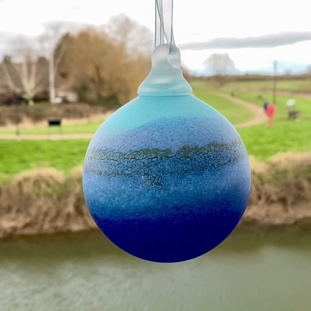 PLEASE NOTE; all pieces vary and some will have BLUE at the top and AQUA at the bottom, or a little green or gold - it depends what we have been making and how the range and inspiration evolves. Our baubles are heavier than mass produced, machine made baubles. They aren't suitable for trees as a general rule, although the minis and diamonds may be fine with some trees. They do look great in windows, on stairs etc.