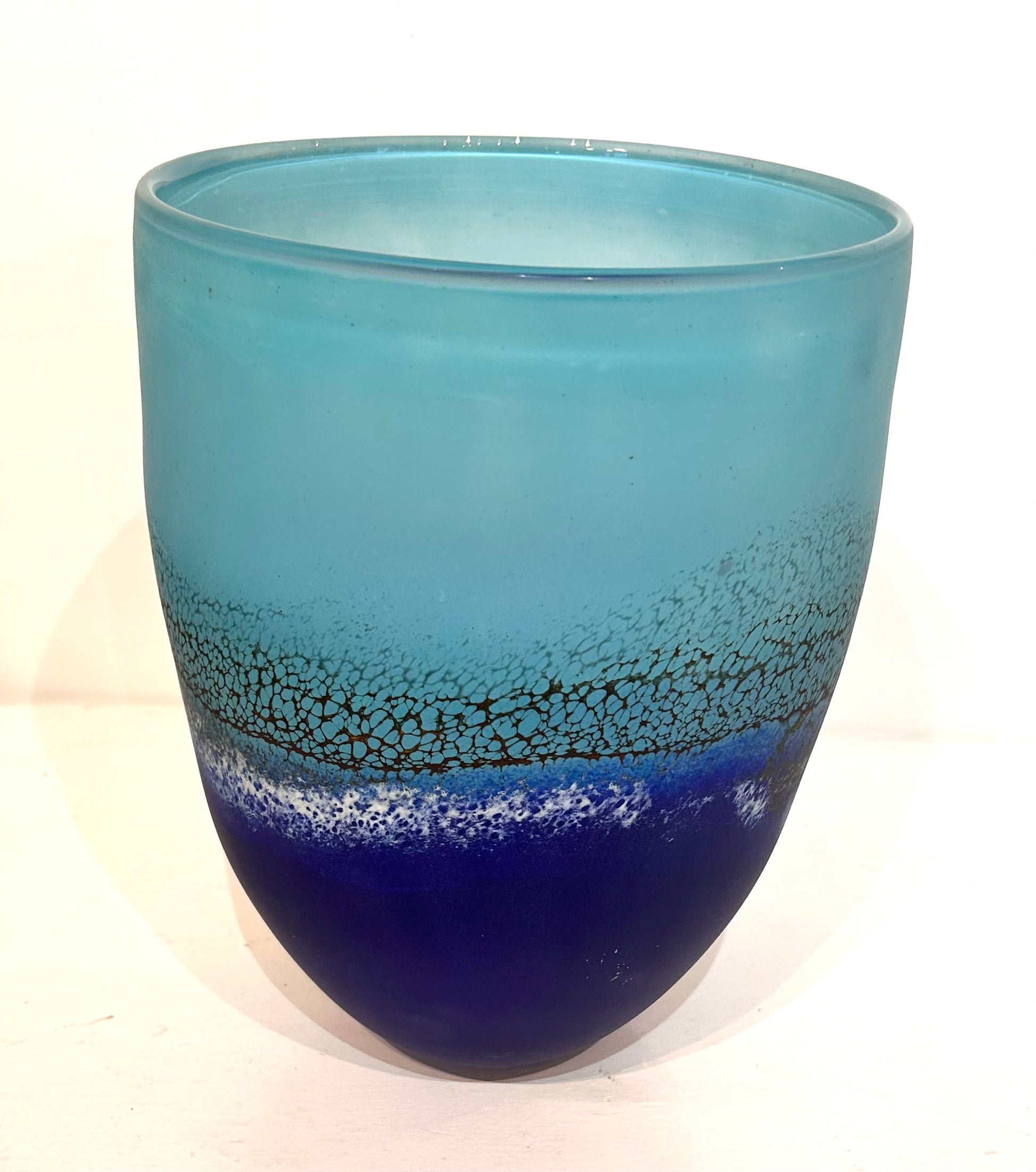 To make these pieces, I start with gathers of clear glass from my furnace - 1, 2, or 3 depending on the size of the piece. The furnace is kept at a constant 1040 C and holds about 140 litres of molten glass, which has the consistency of runny honey. Once I have the required number of gathers on my blowing iron I roll the hot glass [the parison] through powdered frits to give the background canvas colours. This is then heated back up to melt in the powder before rolling the glass parison through more lines of prepared colour to give the detail around the middle of the piece. Only once all the colour is on can the piece be blown into the final form. When finished the piece is put into a kiln that is kept at a constant 500 degrees through the day. This is ramped down overnight to anneall everything I have made during the day. Once cold, we grind the bases of the piece to ensure they stand up straight and then sandblast them to give a matte finish.