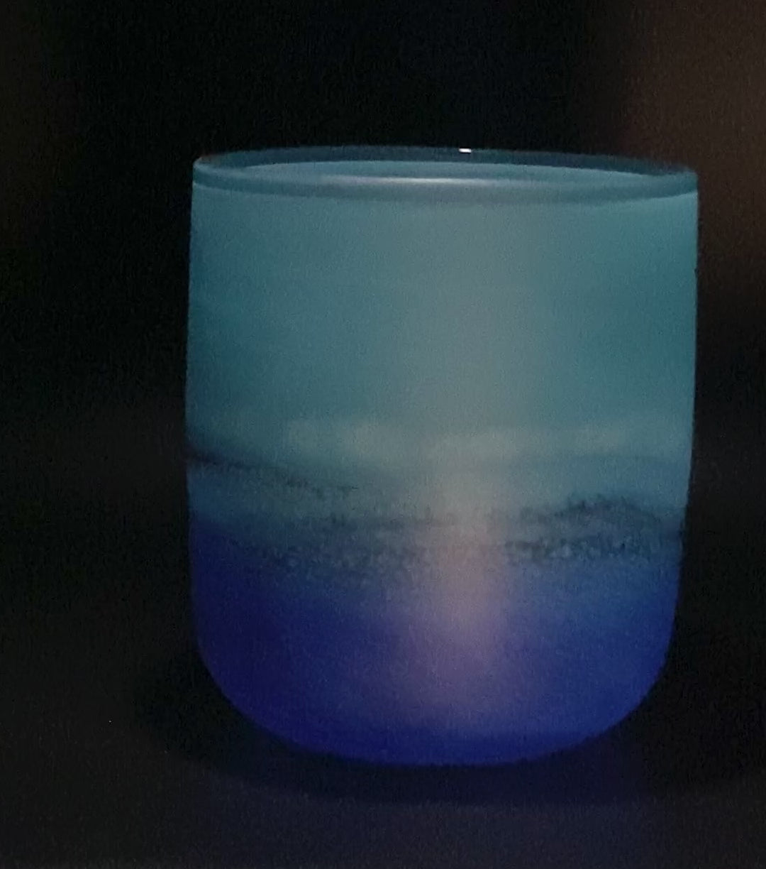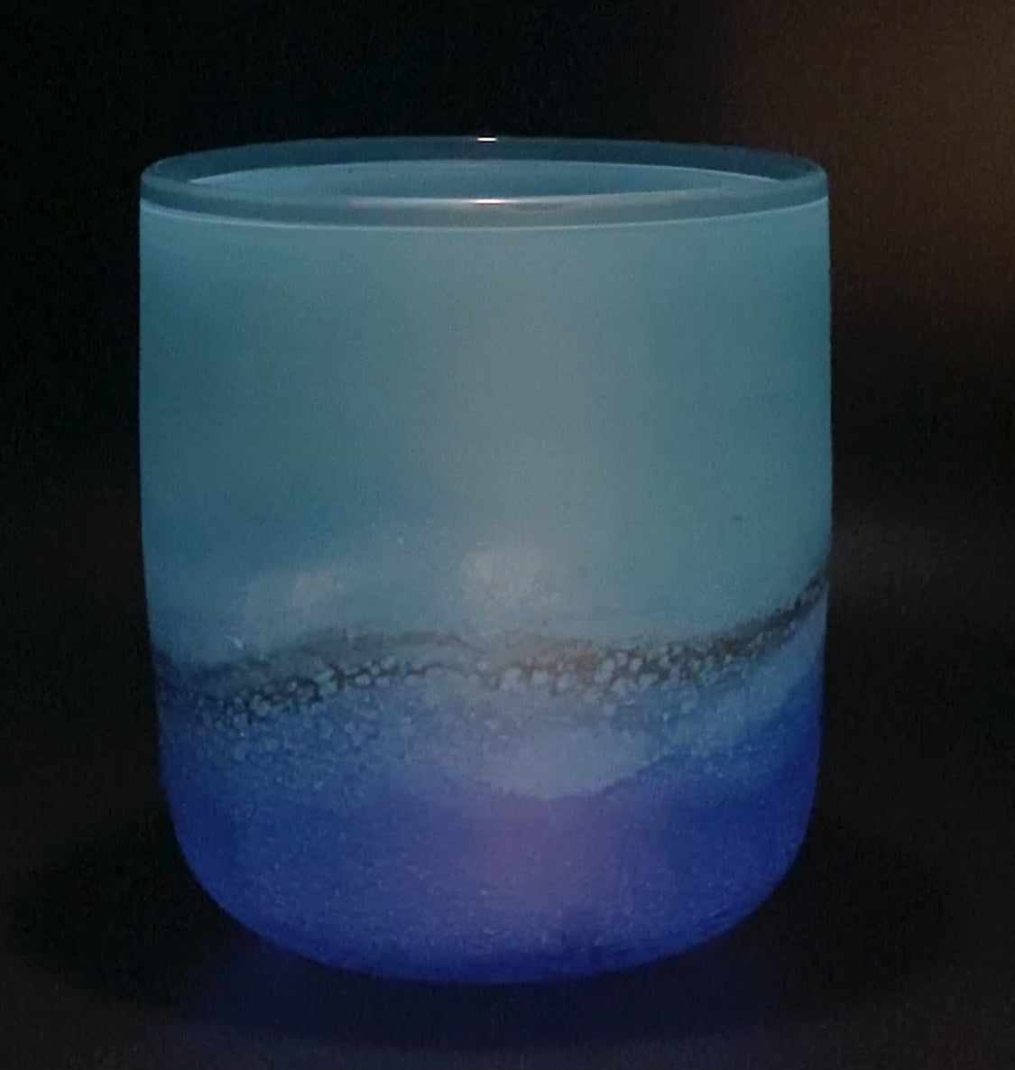 To make these pieces, I start with gathers of clear glass from my furnace - 1, 2, or 3 depending on the size of the piece. The furnace is kept at a constant 1040 C and holds about 140 litres of molten glass, which has the consistency of runny honey. Once I have the required number of gathers on my blowing iron I roll the hot glass [the parison] through powdered frits to give the background canvas colours. This is then heated back up to melt in the powder before rolling the glass parison through more lines of prepared colour to give the detail around the middle of the piece. Only once all the colour is on can the piece be blown into the final form. When finished the piece is put into a kiln that is kept at a constant 500 degrees through the day. This is ramped down overnight to anneall everything I have made during the day. Once cold, we grind the bases of the piece to ensure they stand up straight and then sandblast them to give a matte finish.