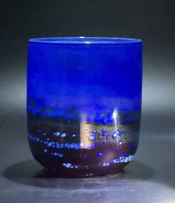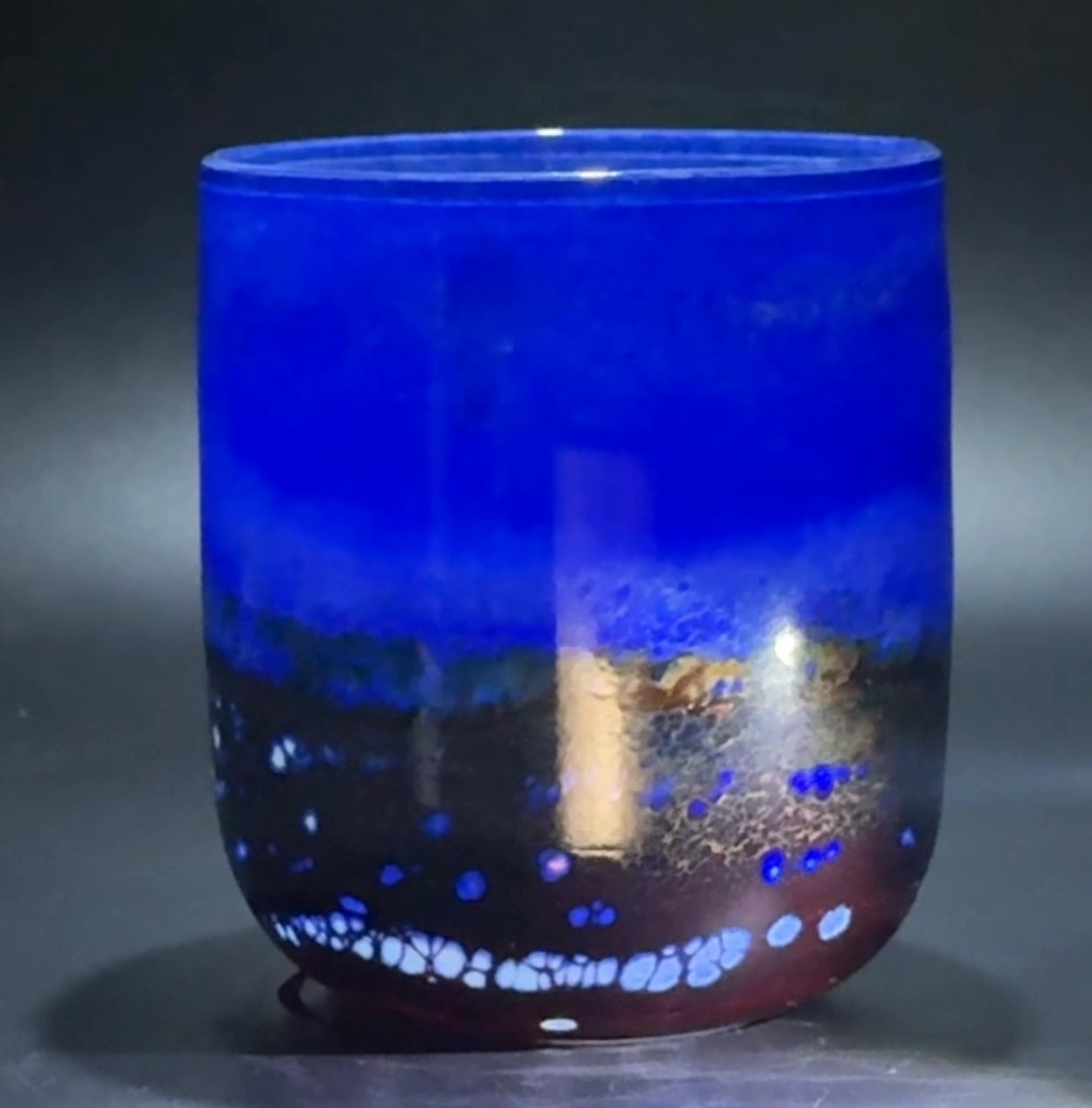 To make these pieces, I start with gathers of clear glass from my furnace - 1, 2, or 3 depending on the size of the piece. The furnace is kept at a constant 1040 C and holds about 140 litres of molten glass, which has the consistency of runny honey. Once I have the required number of gathers on my blowing iron I roll the hot glass [the parison] through powdered frits to give the background canvas colours. This is then heated back up to melt in the powder before rolling the glass parison through more lines of prepared colour to give the detail around the middle of the piece. Only once all the colour is on can the piece be blown into the final form. When finished the piece is put into a kiln that is kept at a constant 500 degrees through the day. This is ramped down overnight to anneall everything I have made during the day. Once cold, we grind the bases of the piece to ensure they stand up straight and then sandblast them to give a matte finish.