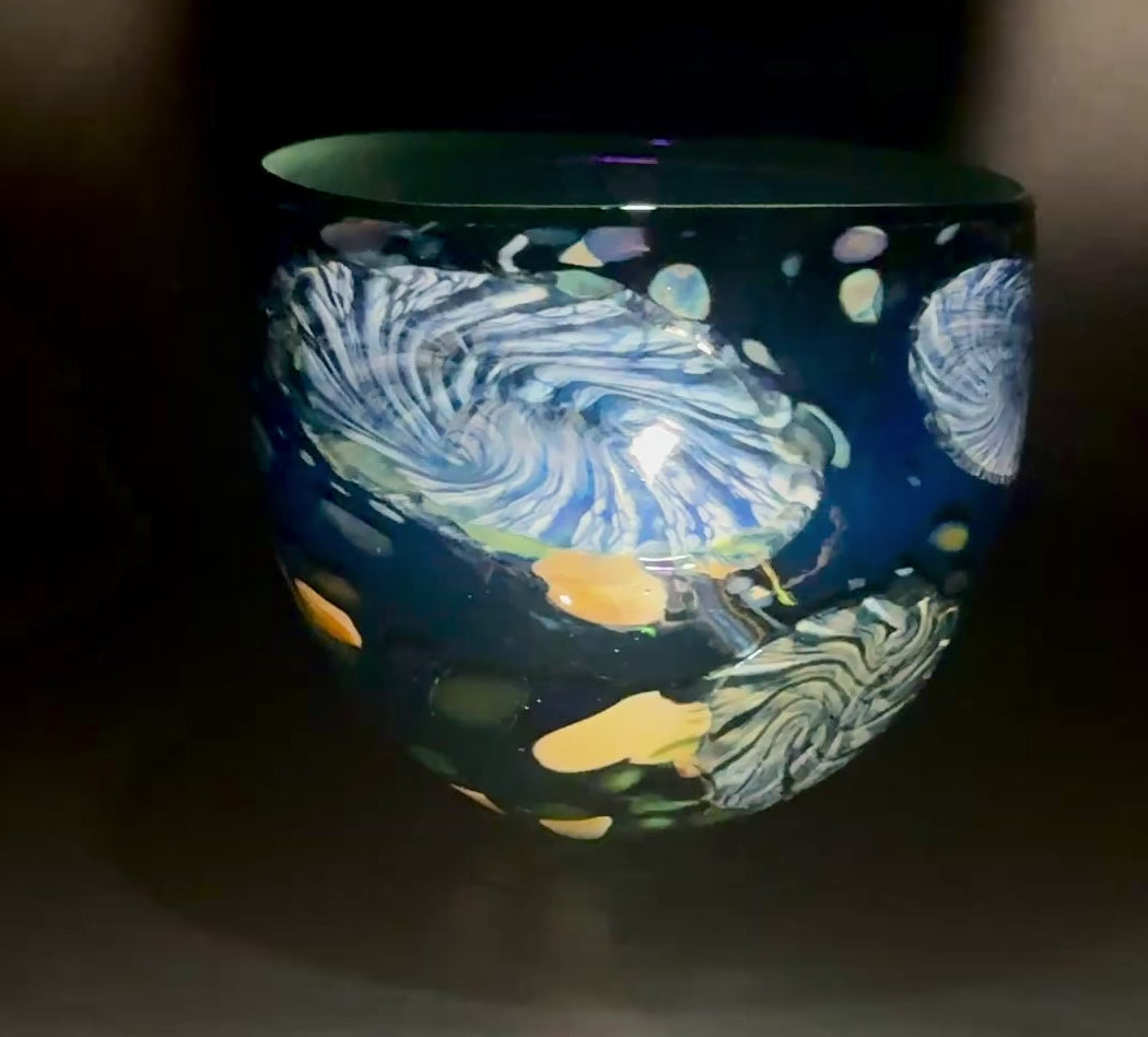 The round discs and canes in the design are made separately. These pieces are inside cased ( applying a small piece of coloured glass to the blowing iron before gathering any clear glass. The discs are then reheated and applied to the last gather of glass on top of the canes and frits. The whole parison then has to be heated up and reshaped before being blown into the final shape - puntied and opened up.