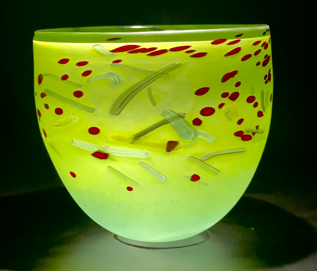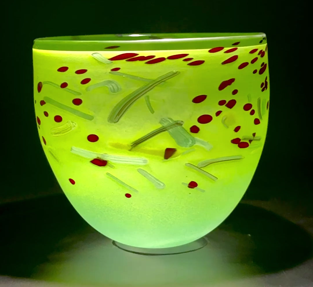 To make these pieces, we first roll the hot glass in green coloured powder, then green and brown glass canes with red glass frits for the red berries. Each piece is sandblasted after to give the matte finish.