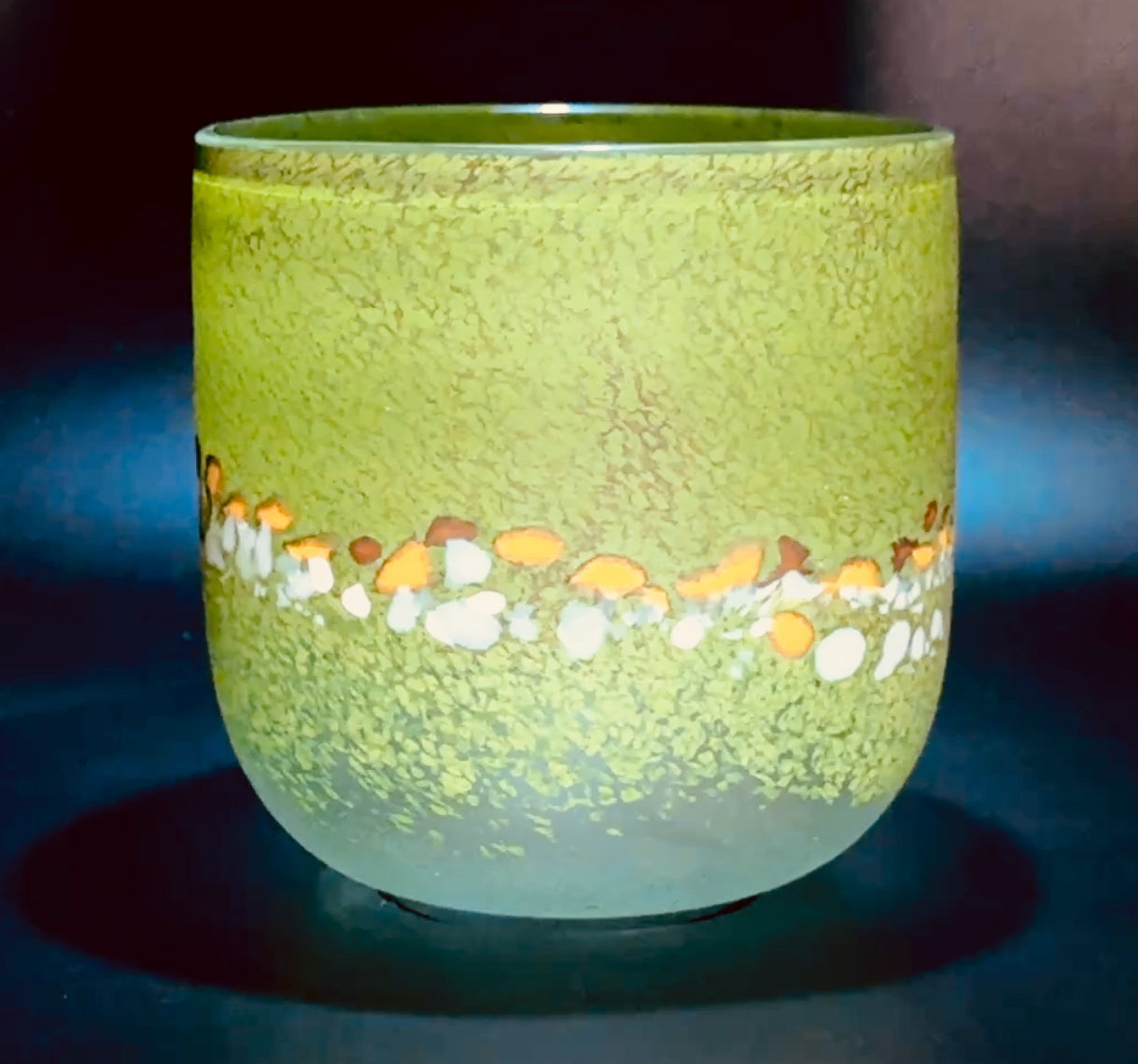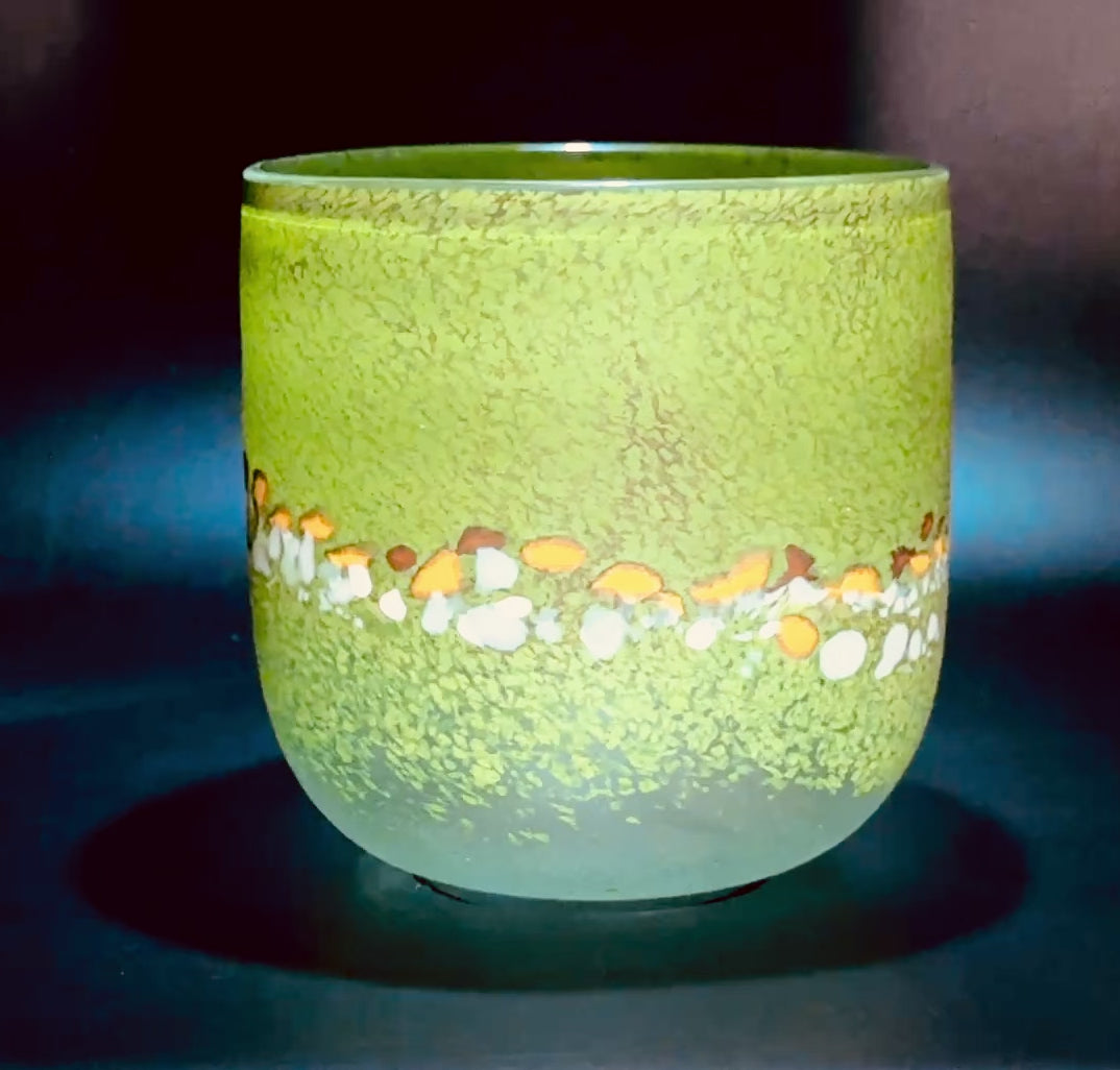 To make these pieces, we first roll the hot glass in green coloured powder, then green and brown glass canes with yellow and whit glass frits for the daffs and snowdrops . Each piece is sandblasted after to give the matte finish.