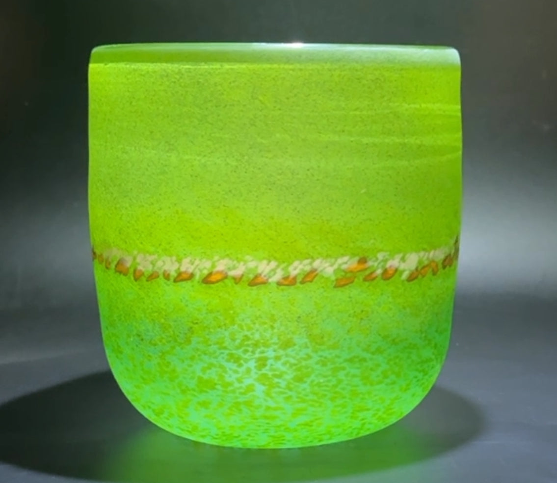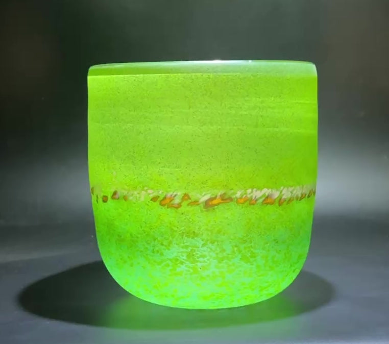 To make these pieces, we first roll the hot glass in green coloured powder, then green and brown glass canes with yellow and whit glass frits for the daffs and snowdrops . Each piece is sandblasted after to give the matte finish.