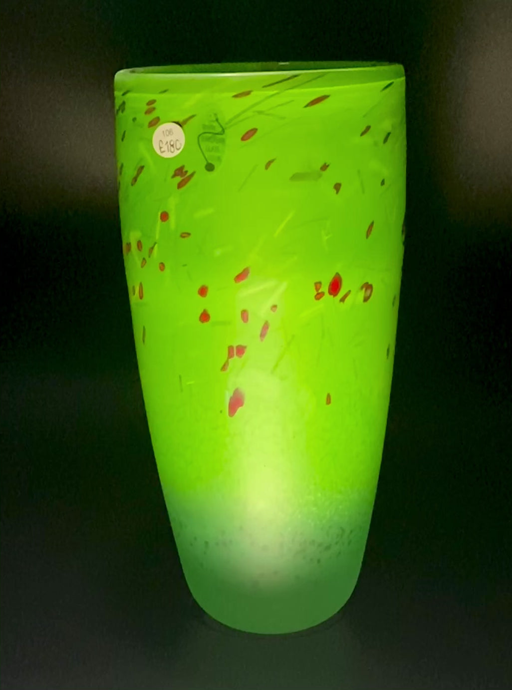 To make these pieces, we first roll the hot glass in green coloured powder, then green and brown glass canes with red glass frits for the red berries. Each piece is sandblasted after to give the matte finish.