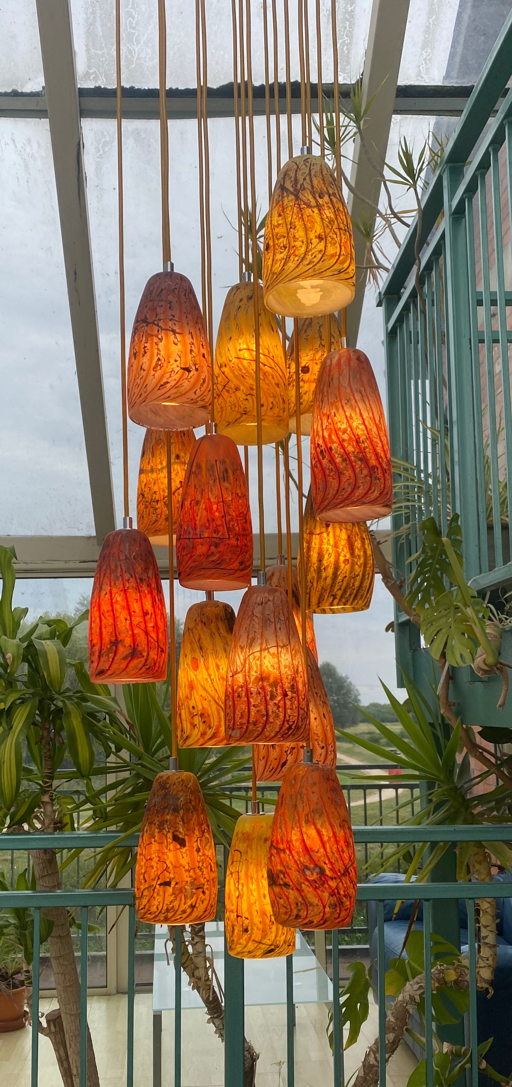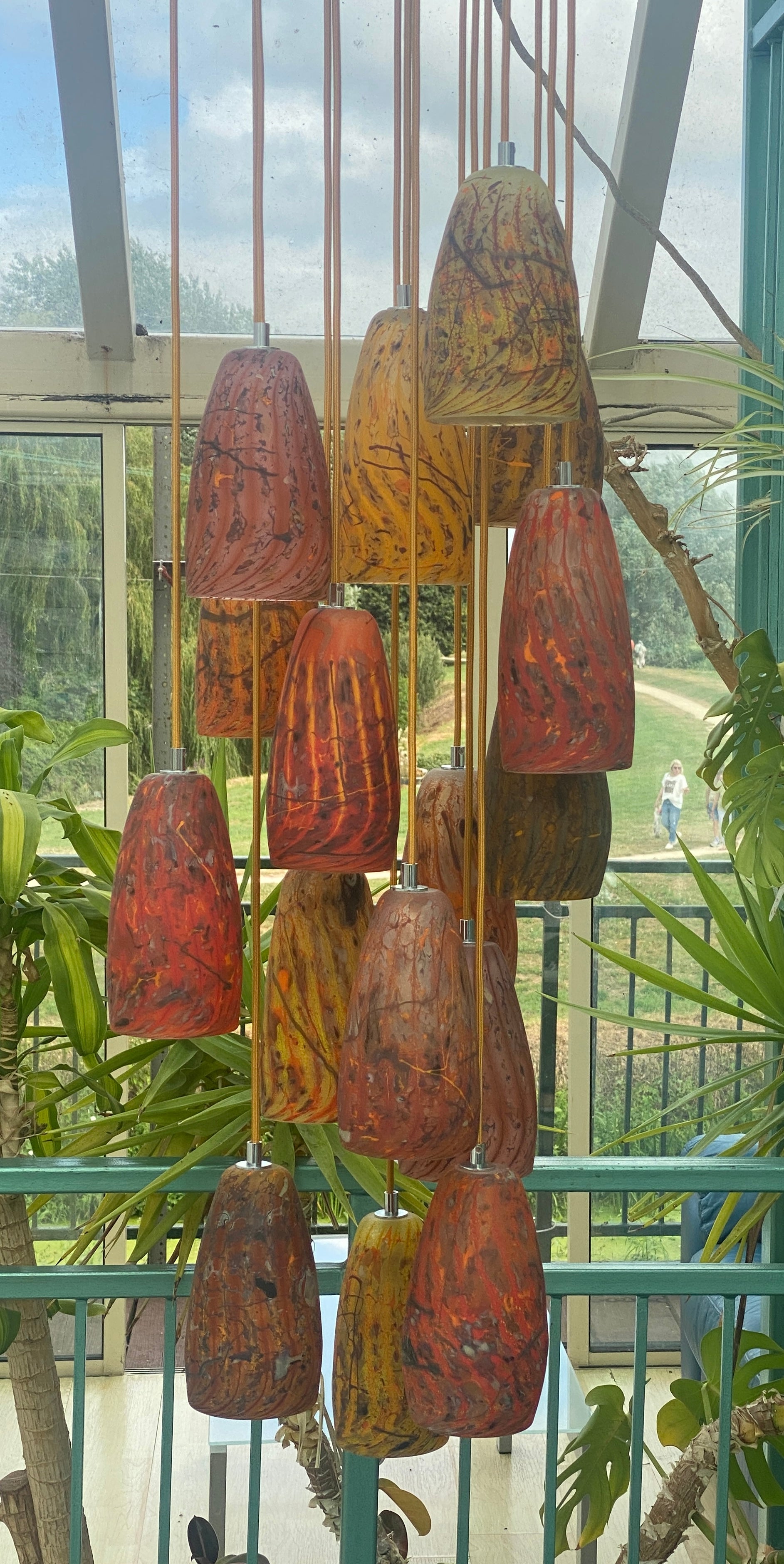 Each individual piece is different, but made in the same red/orange/gold spectrum of colour.