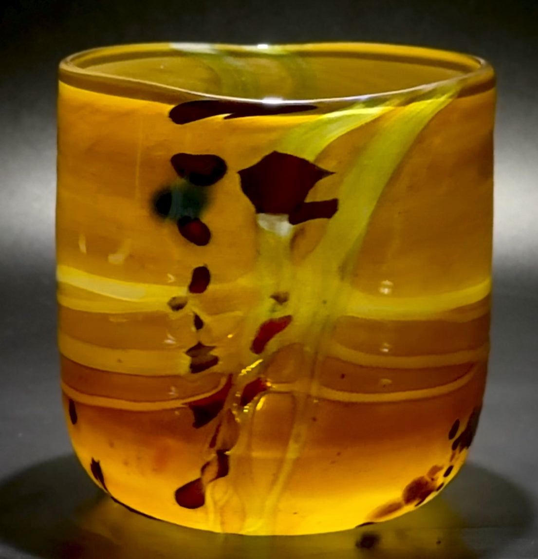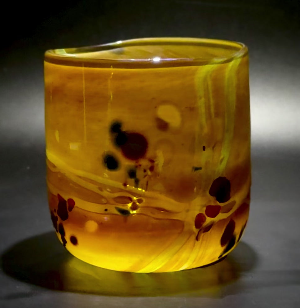 The Lustre Rocks range work particularly well in changing light situations; when the light is coming through the pieces you get the underlying blues and autumn colours and when the light is reflected off the surface you see the lustred effects. Each piece is coated in powdered coloured glass and then has a powdered trail woven around the middle and over the top. To finish off, the piece is rolled through a selection of frits in different sizes……And then blown and shaped.