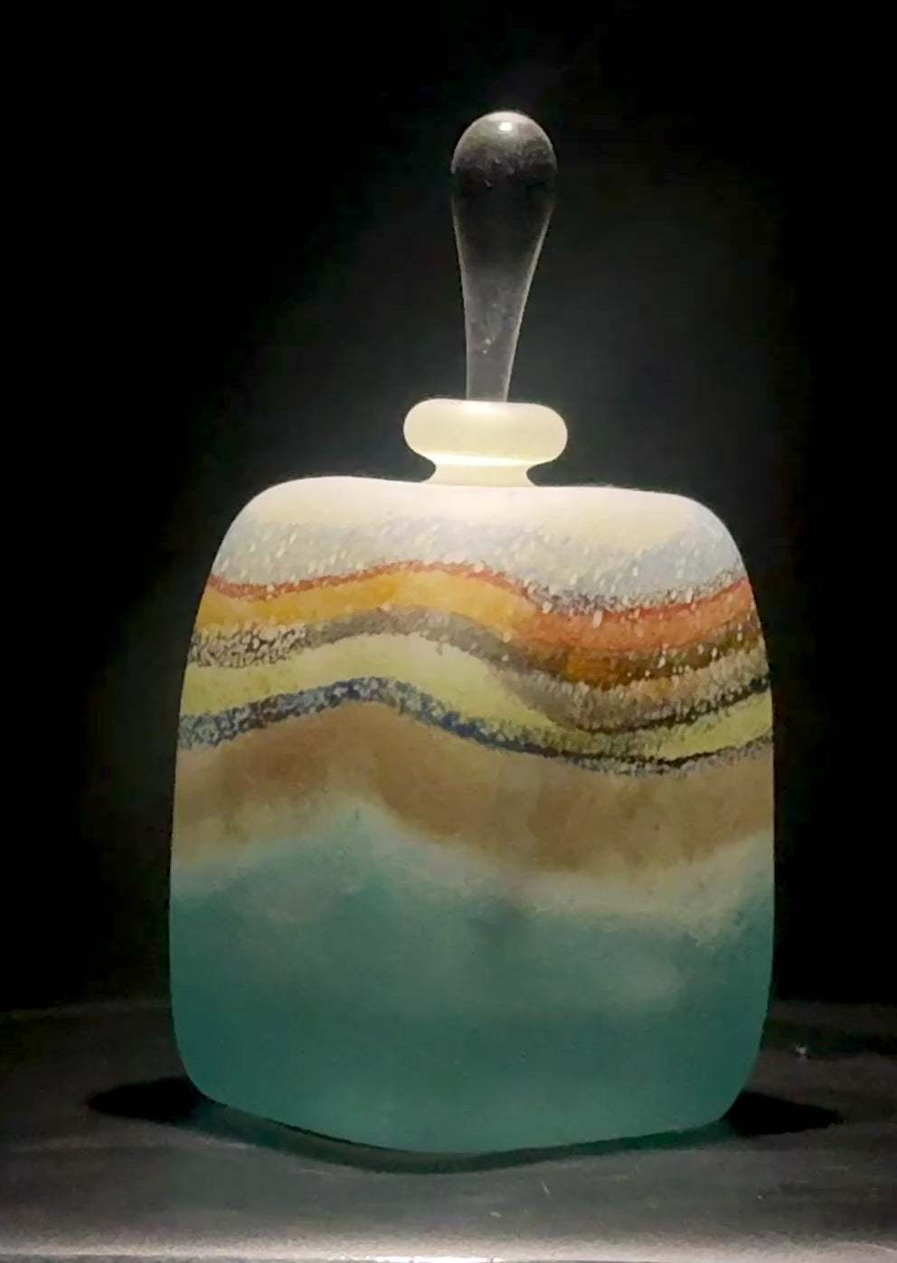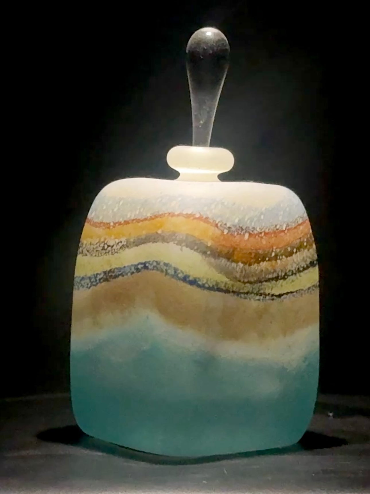 Inspired by French Master artist in glass and painter Maurice Marinot after a visit to the V & A glass collection, the "MM" bottles are always unique. Everything you make by hand is obviously "unique", but some pieces you try to make within certain tolerances of size or shape or decoration - these become roughly speaking ranges that you can replicate. A learning curve, without quite knowing what the lesson is.