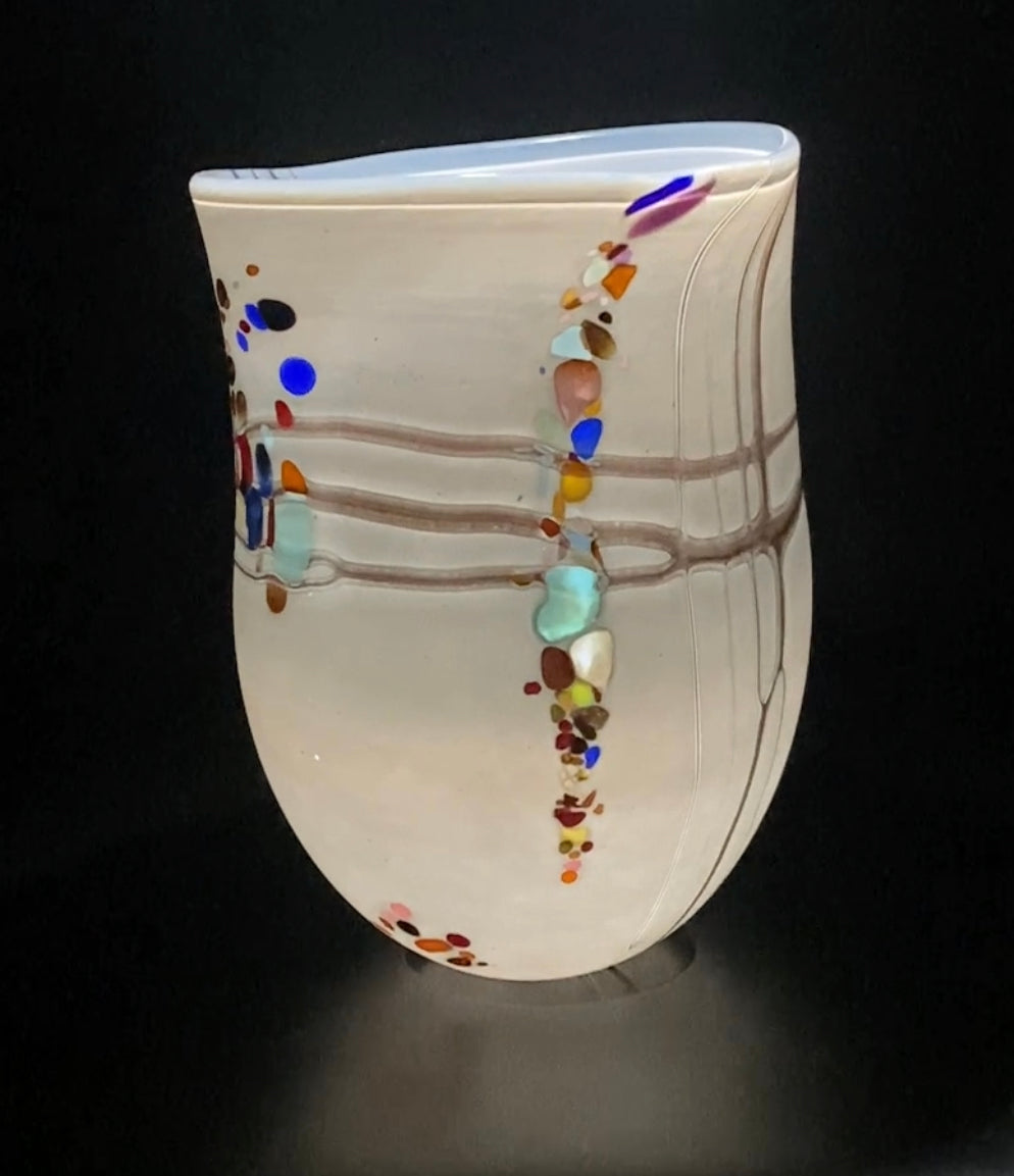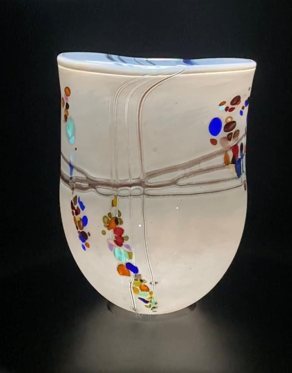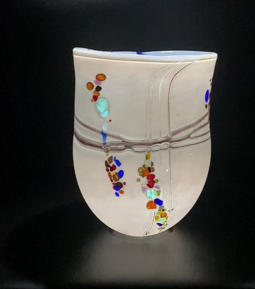 Like most of my pieces, these start with gathers of clear glass. I have a furnace which I keep at 1040 c constantly, it has a crucible inside which holds approximately 140 litres of molten glass when it is full. To start a piece, you need a hot blowing iron, this is the dipped into the molten glass and turned much like winding honey onto a spoon (a gather) If you need to make a larger piece you have to centre the gather ( make it on the same axis as the iron) let it cool before re-dipping the iron in the furnace. This is repeated until you have the amount of glass required, two gathers is generally a medium piece. The gathering size is determined by eye. Once you have the required amount of glass, the gather or parison is rolled through white (or whichever colour you are using for the background) powdered glass frit to coat the surface. Your assistant meanwhile has gathered a small amount of glass on a solid iron and has rolled it through the powder for the trail colour. Both pieces are heated to melt the powders in, the trail is heated up more than the base colour and then the trail is wrapped around the piece over the end and round the middle. This is then all heated up and the parison is now dipped in the coloured chips which have been arranged on another metal table (marver) Again the whole piece is heated up, shaped and finally blown into its final form. Once I'm satisfied, the piece is transferred to a punty iron before the top is heated and finished.