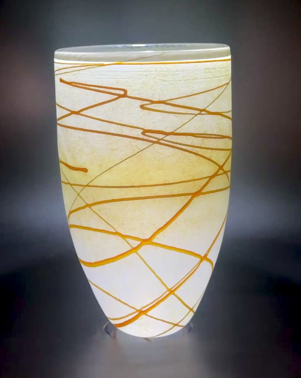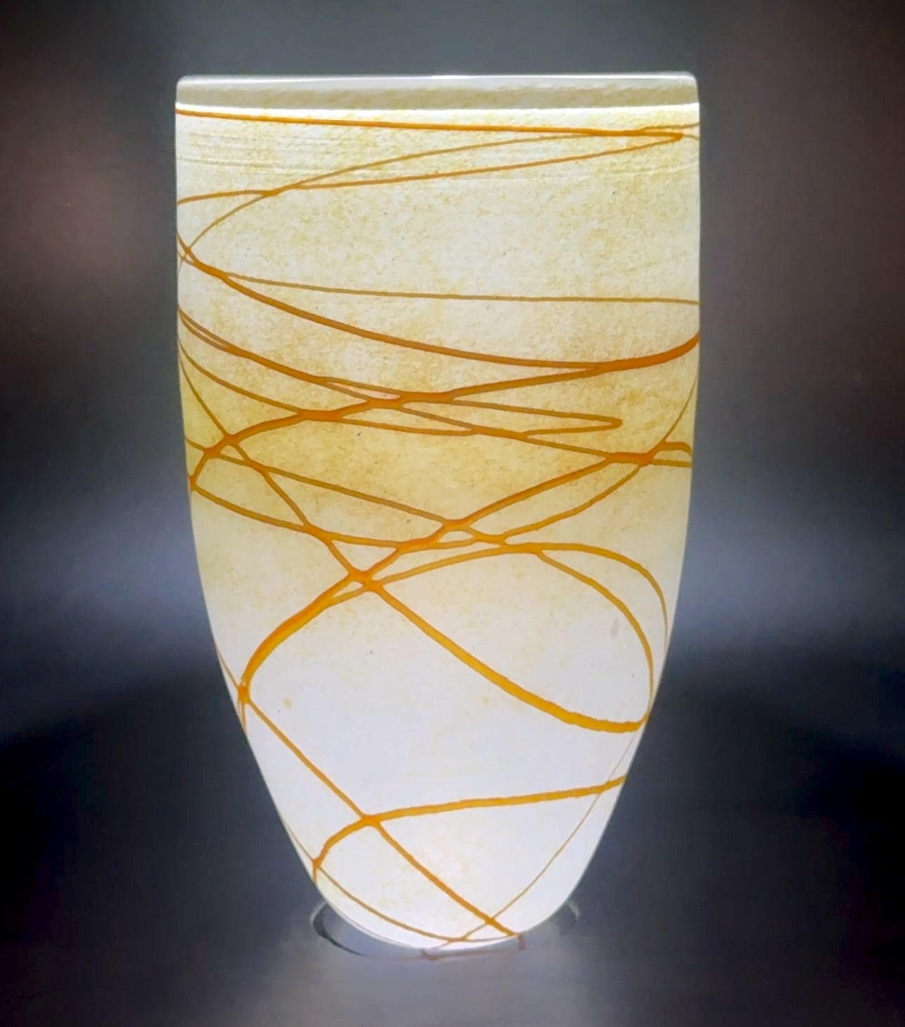 To make these pieces, I start with gathers of clear glass from my furnace - 1, 2, or 3 depending on the size of the piece. The furnace is kept at a constant 1040 C and holds about 140 litres of molten glass, which has the consistency of runny honey. Meanwhile my assistant is preparing the orange and yellow trail. To do this, we have put 2 small pieces of solid colour into a little kiln to heat up to 550 c. which is then gathered onto a small punty iron and shaped into a cone. Once I have the required number of gathers on my blowing iron I roll the hot glass [the parison] through powdered frits to give the background colour. This is then heated back up to melt in the powder. I let this cool a little so that the glass is more solid before my assistant brings me the colours as hot as they can - this is then "randomly" wrapped around my coloured gather (parison) Once again everything is heated up and recentred. Only once all the colour is on can the piece be blown into the final form.