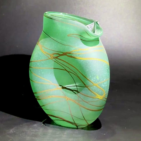 To make these pieces, I start with gathers of clear glass from my furnace - 1, 2, or 3 depending on the size of the piece. The furnace is kept at a constant 1040 C and holds about 140 litres of molten glass, which has the consistency of runny honey. Meanwhile my assistant is preparing the orange and yellow trail. To do this, we have put 2 small pieces of solid colour into a little kiln to heat up to 550 c. which is then gathered onto a small punty iron and shaped into a cone. Once I have the required number of gathers on my blowing iron I roll the hot glass [the parison] through powdered frits to give the background colour. This is then heated back up to melt in the powder. I let this cool a little so that the glass is more solid before my assistant brings me the colours as hot as they can - this is then "randomly" wrapped around my coloured gather (parison) Once again everything is heated up and recentred. Only once all the colour is on can the piece be blown into the final form.