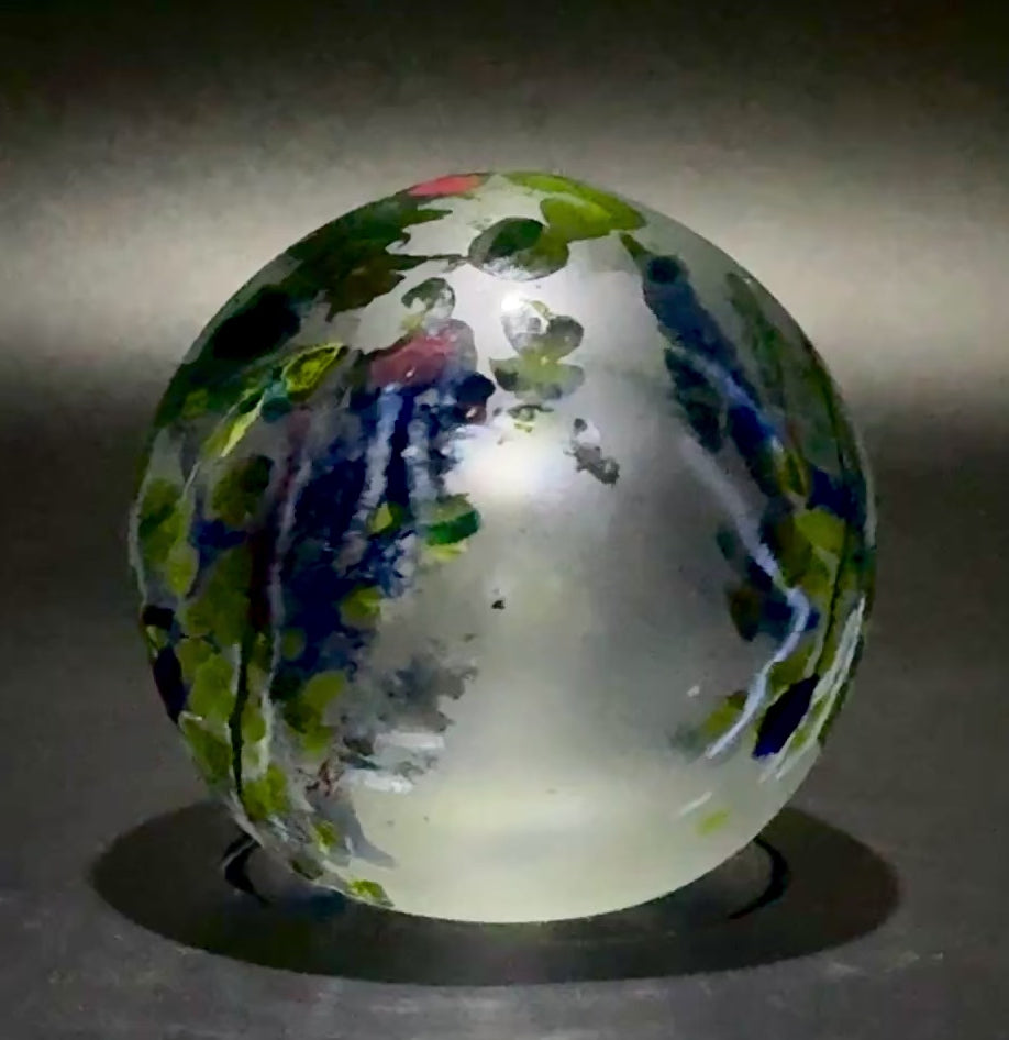 We make the pieces with the colours applied hot, using canes we have pulled and different size frits in many colours, this always gives a completely unique look to every piece. When they come out of the annealer and are cool they are hand painted with a resist and then etched to give the soft matt and shiny surface qualities.
