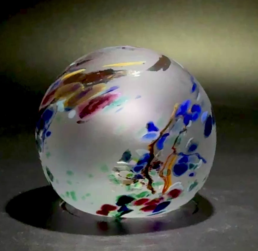 We make the pieces with the colours applied hot, using canes we have pulled and different size frits in many colours, this always gives a completely unique look to every piece. When they come out of the annealer and are cool they are hand painted with a resist and then etched to give the soft matt and shiny surface qualities.
