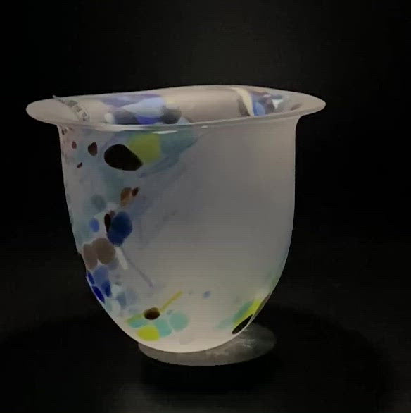 We make the pieces with the colours applied hot, using canes we have pulled and different size frits in many colours, this always gives a completely unique look to every piece. When they come out of the annealer and are cool they are hand painted with a resist and then etched to give the soft matt and shiny surface qualities.