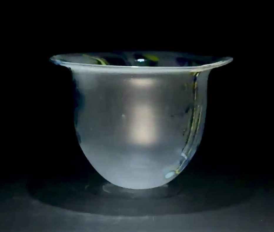 We make the pieces with the colours applied hot, using canes we have pulled and different size frits in many colours, this always gives a completely unique look to every piece. When they come out of the annealer and are cool they are hand painted with a resist and then etched to give the soft matt and shiny surface qualities.