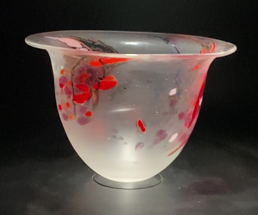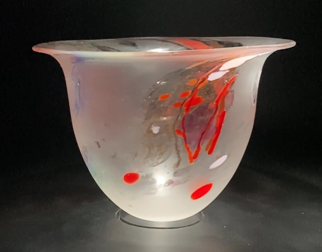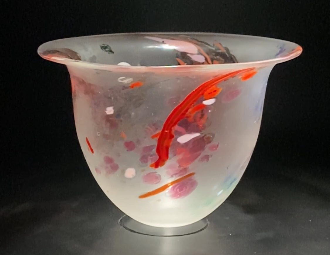 We make the pieces with the colours applied hot, using canes we have pulled and different size frits in many colours, this always gives a completely unique look to every piece. When they come out of the annealer and are cool they are hand painted with a resist and then etched to give the soft matt and shiny surface qualities.
