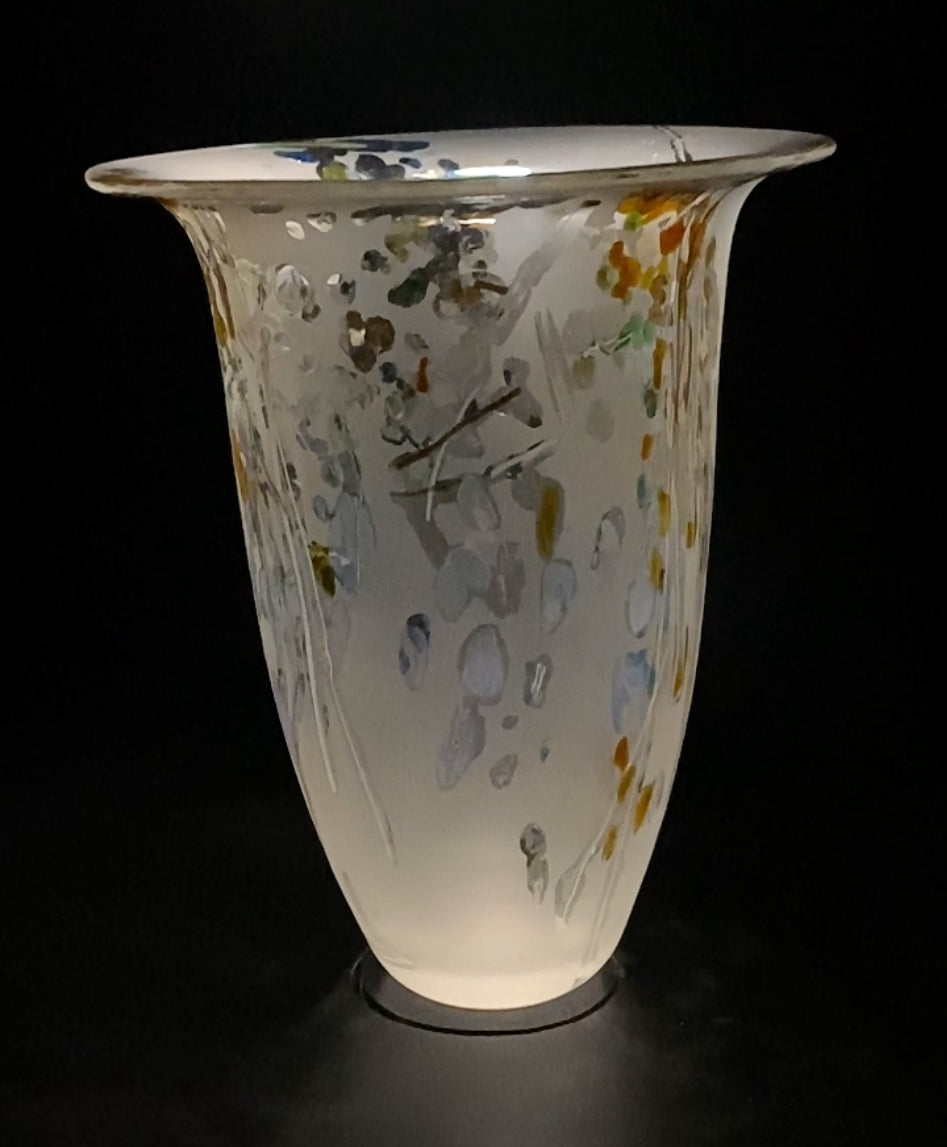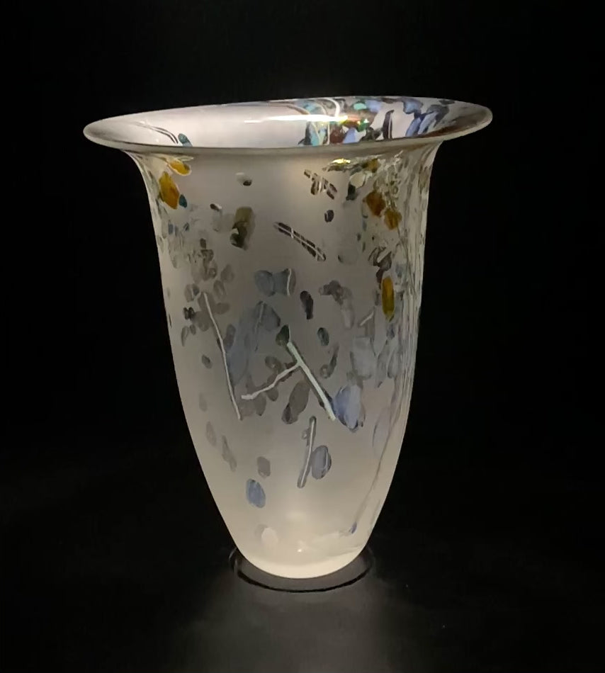 We make the pieces with the colours applied hot, using canes we have pulled and different size frits in many colours, this always gives a completely unique look to every piece. When they come out of the annealer and are cool they are hand painted with a resist and then etched to give the soft matt and shiny surface qualities.