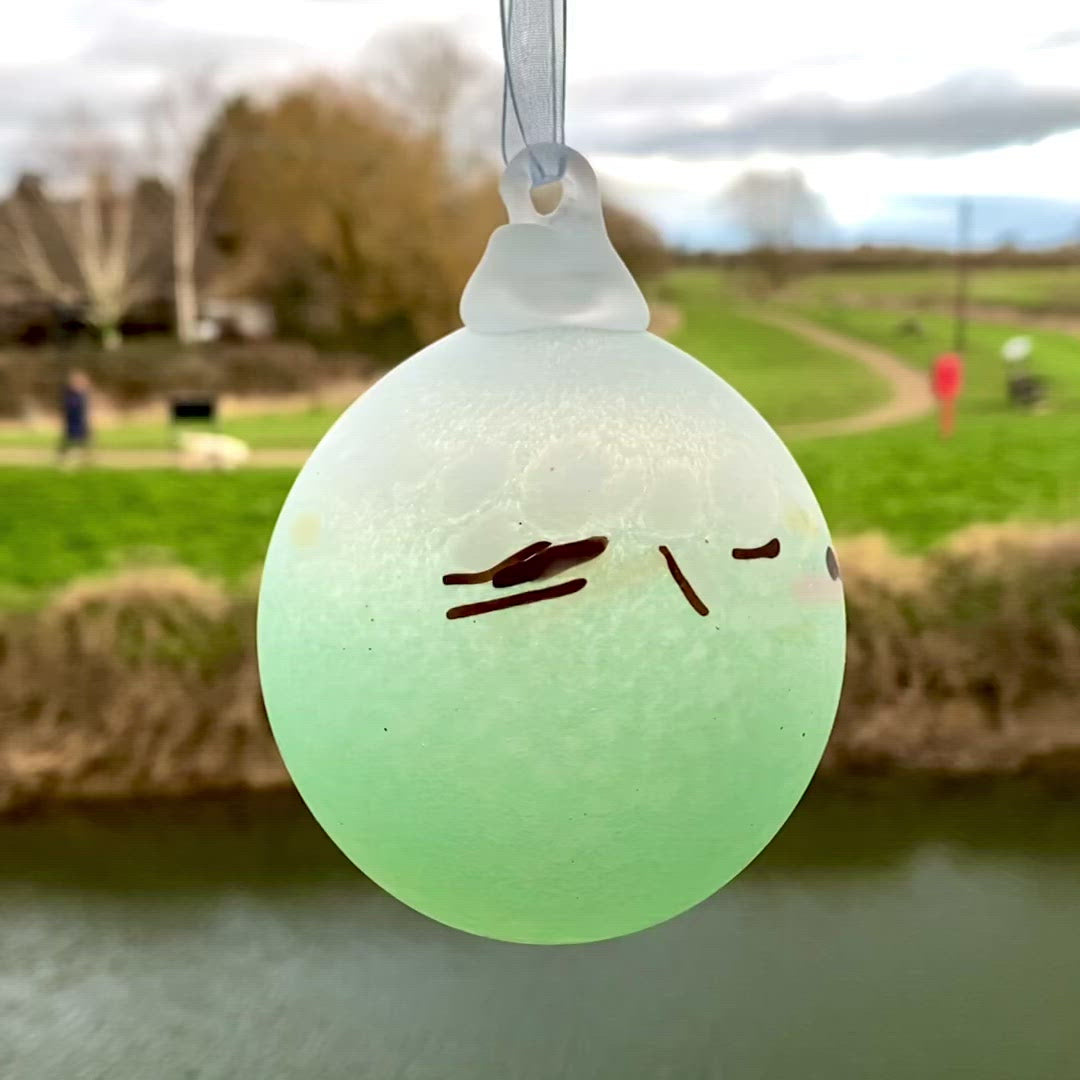 The Somerset Bauble is made from soda glass, which we melt in our furnace at 1160 degrees. The glass is coated with 3 different coloured glass powders while hot. The parison is then reheated to fuse before we add the stringers and frits to give our bauble its unique design. The final piece is then sandblasted when cold to give it a matte finish.