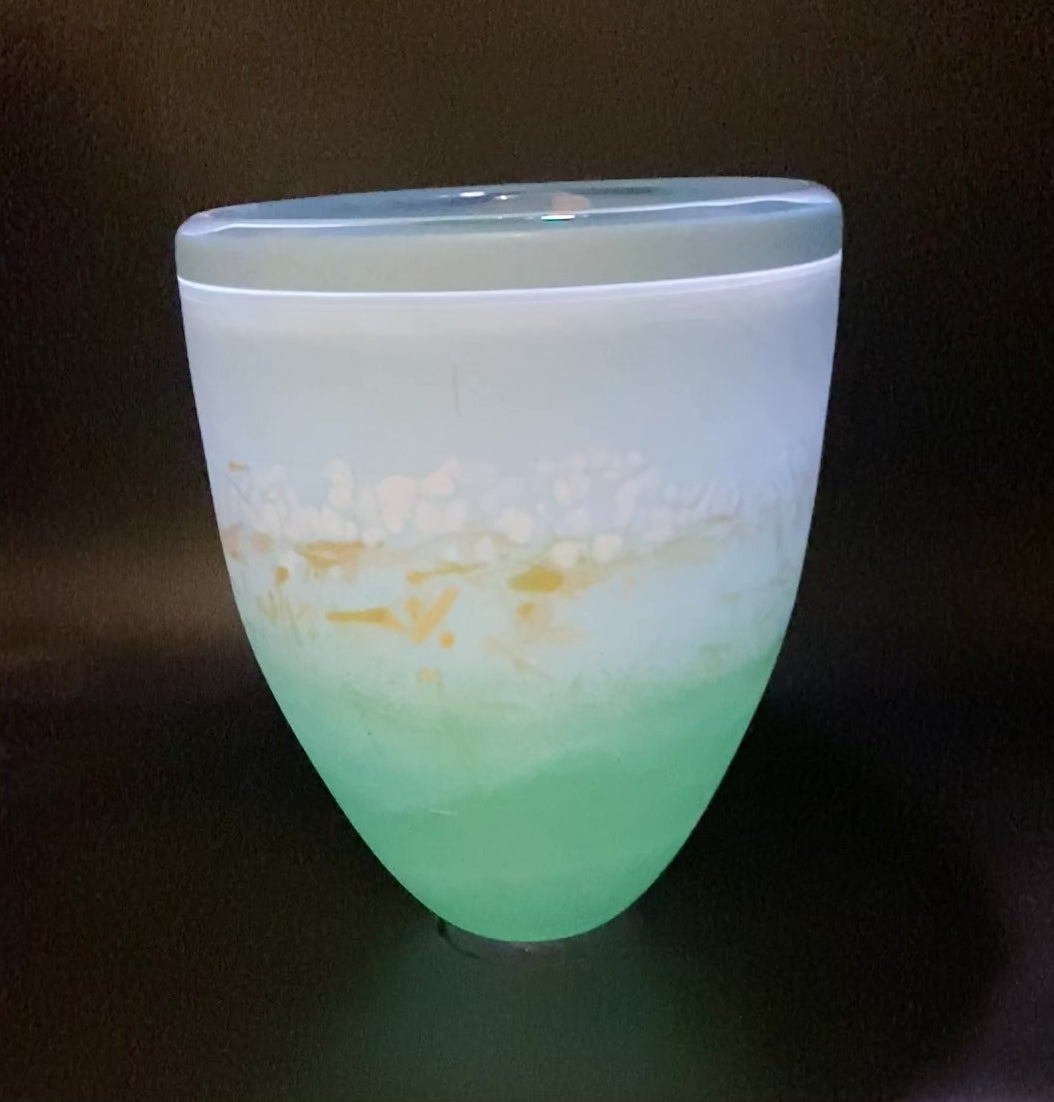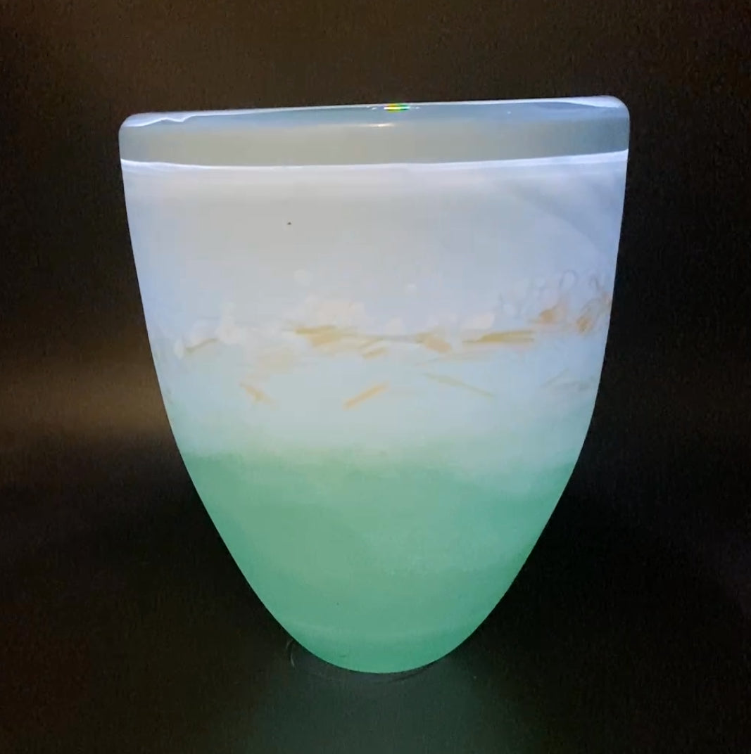 The vase is coated with 3 different coloured glass powders while hot. The parison is then reheated to fuse before we add the stringers and frits to give the piece it's unique design. The final piece is then sandblasted when cold to give it a matte finish.