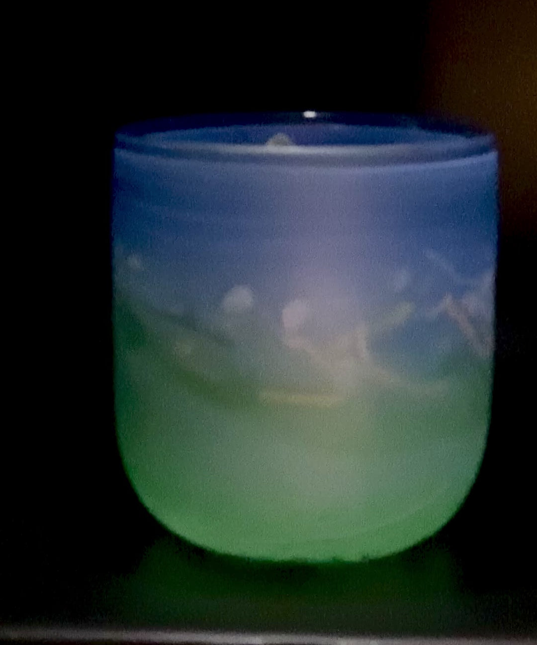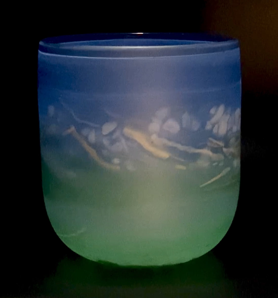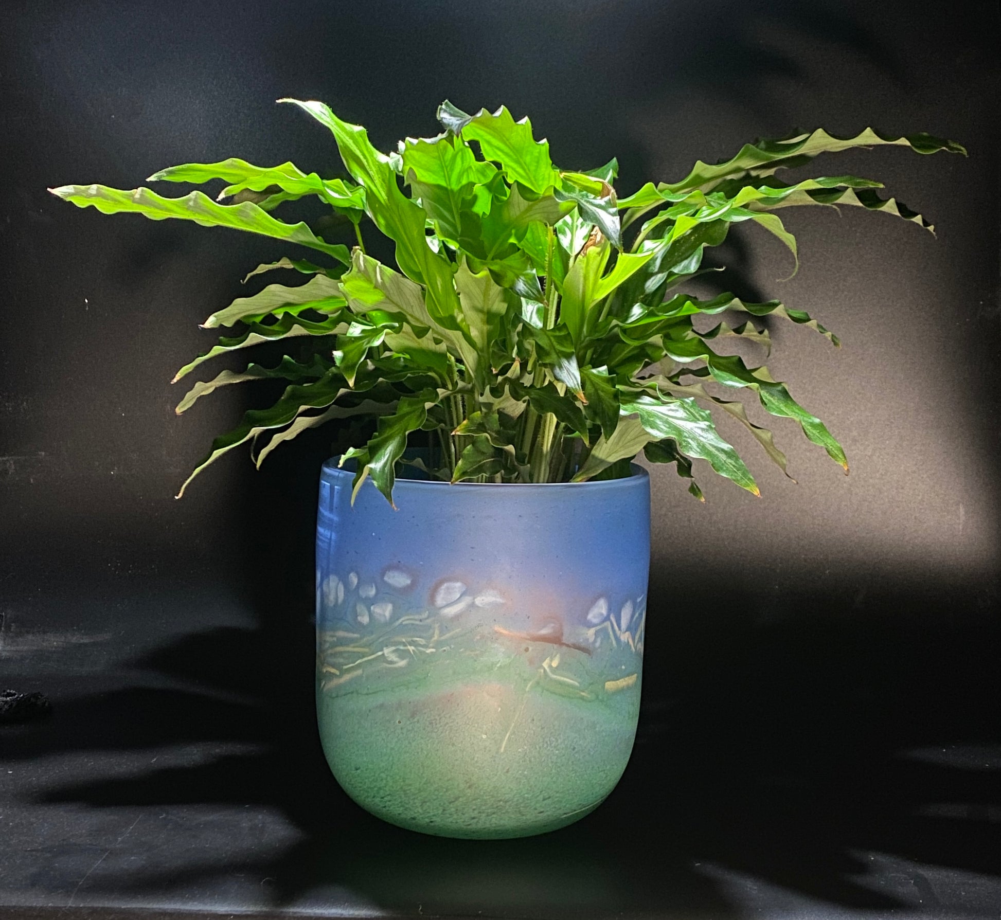 The vase is coated with 3 different coloured glass powders while hot. The parison is then reheated to fuse before we add the stringers and frits to give the piece it's unique design. The final piece is then sandblasted when cold to give it a matte finish.