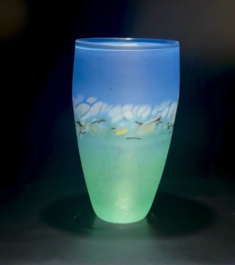 The vase is coated with 3 different coloured glass powders while hot. The parison is then reheated to fuse before we add the stringers and frits to give the piece it's unique design. The final piece is then sandblasted when cold to give it a matte finish.