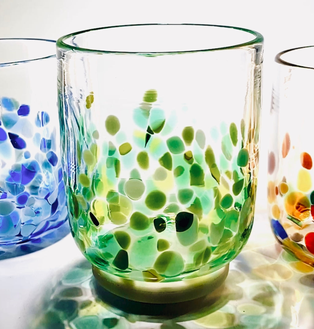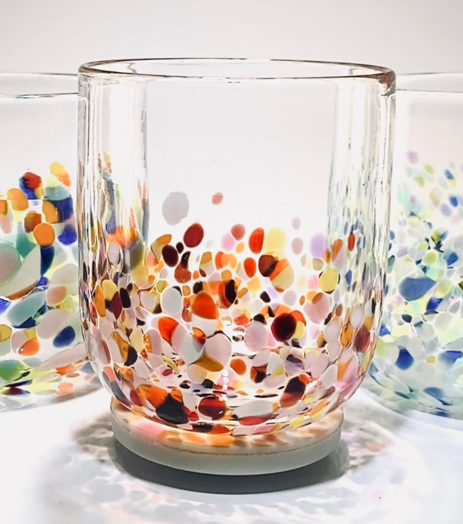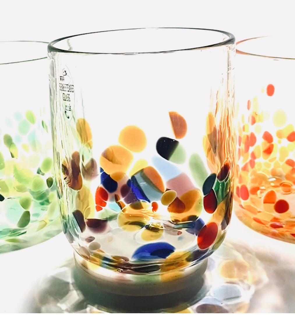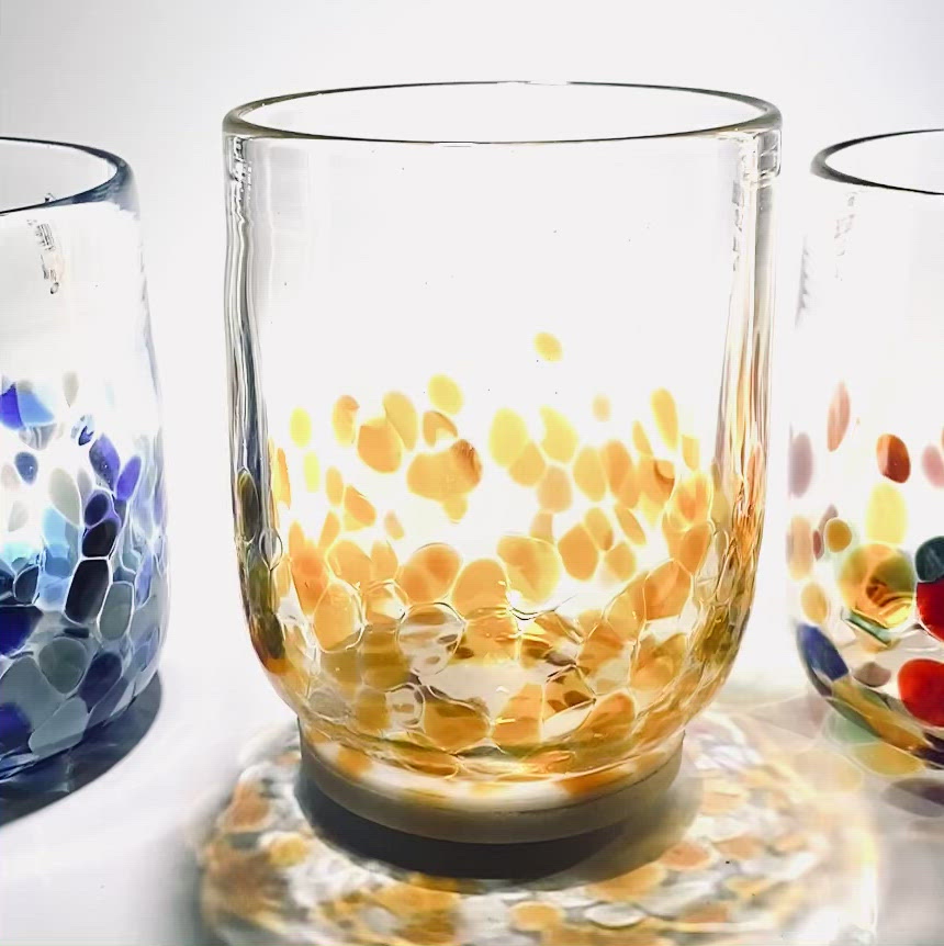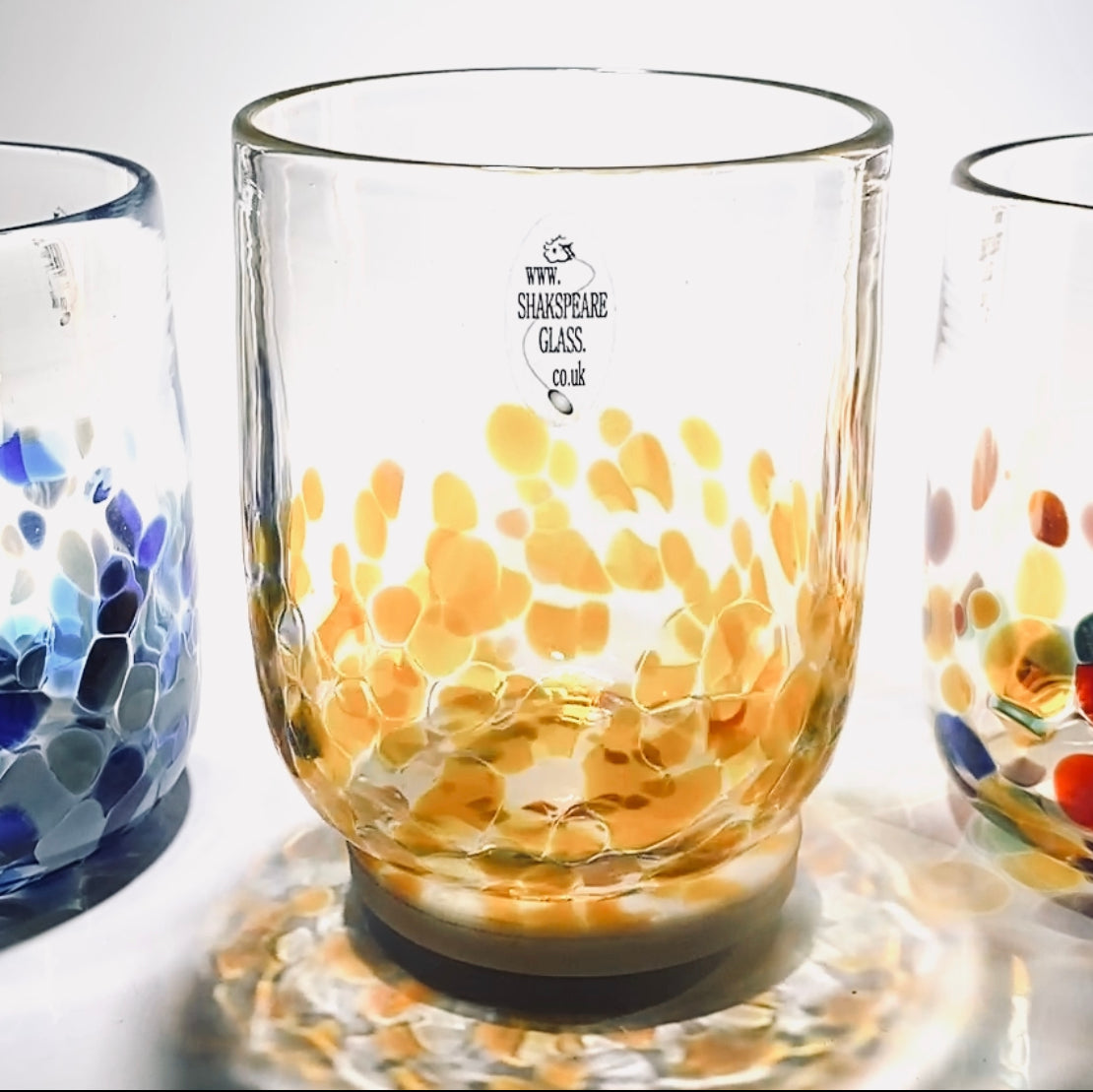 Please note that our tumblers may differ from glass to glass, due to the fact that they are completely handmade. If you order more than one we will send you tumblers of a very similar size, however we guarantee they will all be slightly different. If this worries you there are many good retail stores that sell identical mass produced glass!!
